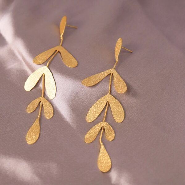 Make a bold yet refined statement with these intricately crafted earrings, featuring cascading leaves that exude sophistication and nature’s grace. Their striking movement and light-catching design effortlessly balance elegance and drama, adding a touch of glamour to any ensemble.