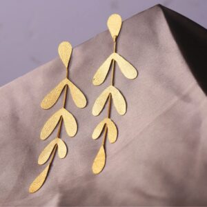 Make a bold yet refined statement with these earrings, designed to captivate, each intricately crafted leaf exudes sophistication and adds a touch of nature’s grace to your look. The cascading design creates striking movement, catching the light beautifully with every turn. Perfect for those who seek a balance of elegance and drama, these earrings are a must-have for adding a touch of effortless glamour to any ensemble.